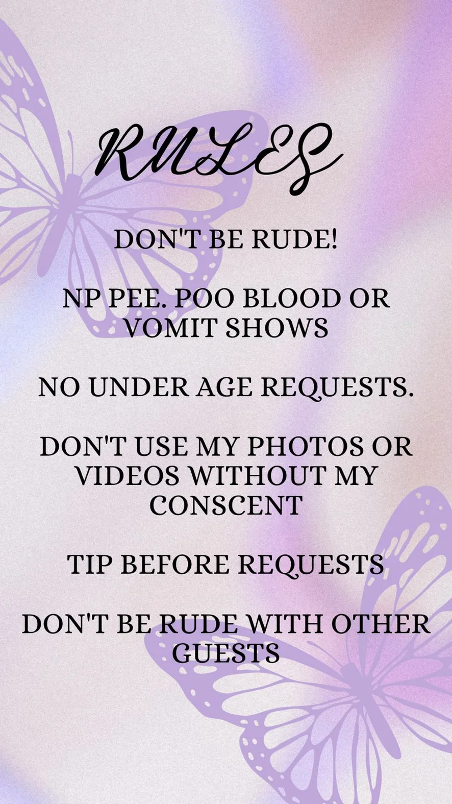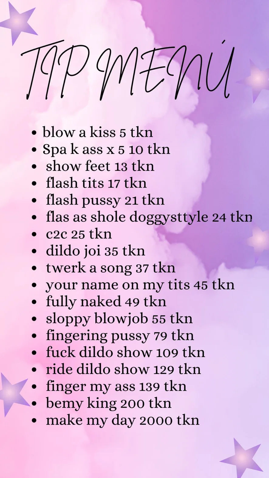 Doggy style, Spanking, Kameltå, Erotisk dans, Bedømmelse af pik, Ahegao, Finger, Dildo eller vibrator, Dirty talk, Striptease, Rollespil, Sexlegetøj, Onani, Hæle, Topløs, Creampie, Cuckold, Deepthroat, Massage, Orgasme, Olieshow, Twerk, Upskirt, Cowgirl, Ydmygelse, Brystvortelegetøj, Sprøjt, Anallegetøj, Brystsex